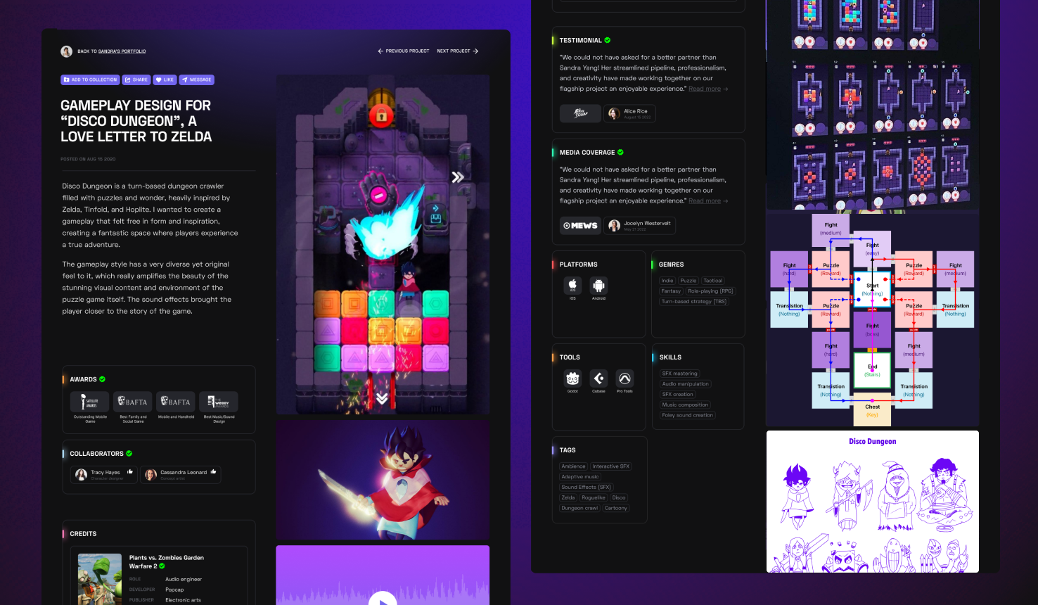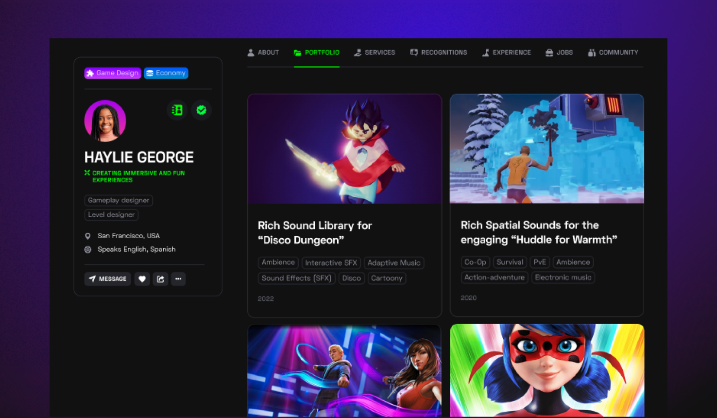 Your Portfolio has space for up to eight projects. Each Portfolio project is an opportunity to show off what you have to offer as a talented professional and passionate game creator. Identify all the skills, tools, platforms, and genres that you understand and want to be discovered for. Select from a thorough taxonomy of both professional industry terms and general skills, such as project management and team building. Each relevant tag improves the possibility of being discovered! You can claim credits for any shipped games that you contributed work to. In an industry that lacks standards for crediting talent, this is valuable for anyone who has a hand in bringing a game to life; game designers, developers, artists, composers. If you helped make a game possible, you deserve to claim that work as a credit.